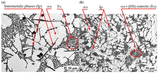 The morphology of eutectic silicon in the form of thin fibers is obtained by using sodium or strontium [1,2,3,4,5,6,7,8,9,10]. The advantage of strontium over sodium is its long-term action. Its ability to modify Si morphology persists even after multiple remelting cycles. The most used modifier reducing the interphase distance of the αAl + β(Si) eutectic mixture is antimony. The modification of both Sr and Sb significantly increases the tensile strength and elongation and slightly increases the hardness of Al-Si alloy [2,6].