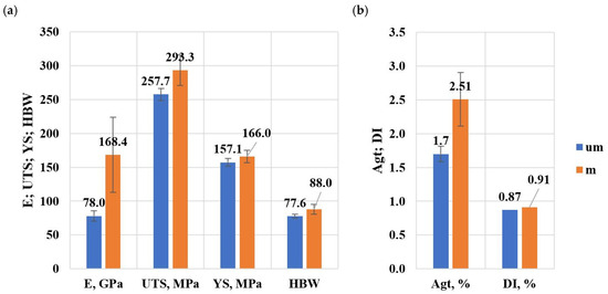 Summary of average values of mechanical properties and density index of the tested alloy: (a) E, UTS, YS, HBW, (b) Agt, DI.