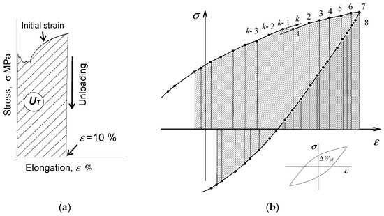 where —the number of measurements of the instantaneous value of the force loading the sample and its deformation during one loading cycle. Stress is calculated as the ratio of the instantaneous value of the force loading the sample, , by the area of the initial cross-section of the sample, . The scheme for calculating the energy under variable loading conditions is shown in Figure 1b.