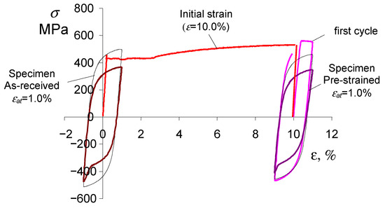 Fatigue tests were conducted using undeformed specimens (as-received) and specimens subjected to preliminary deformation . The speed of the piston of the testing machine during preloading was the same as during static tensile testing, and was 0.05 mm/s. After unloading, the specimens were subjected to cyclic loading at five levels of controlled strain ( = 0.25%, 0.35%, 0.5%, 0.8%, 1.0%). Figure 4 shows schematically the methodology adopted for testing the as-delivered and pre-strained specimens.