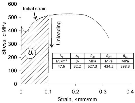 Figure 1 shows the value of energy obtained during the pre-strain stage. For the applied deformation level (), it can be assumed that there is no change in the cross-section area of the specimen during pre-strain (the engineering stress has the same value as the true stress). Thus, the measure of energy dissipated during pre-strain, , is the area under the tensile diagram. This area can be determined from the following relation: