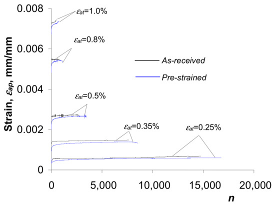 Based on the analysis of the results of the low-cycle fatigue tests, it can be concluded that at the same strain amplitude levels the durability of the pre-strained specimens is slightly higher than that of the as-received specimens. The increase in durability is a consequence of the reduction in strain due to pre-strain (see Figure 6). The increase in the durability of pre-strained specimens is more pronounced at lower total strain amplitude levels . As the strain increases, the difference in the obtained durability decreases. Experimental details of the effect of pre-strain on the durability of S420M steel specimens under controlled deformation conditions are described in [20].
