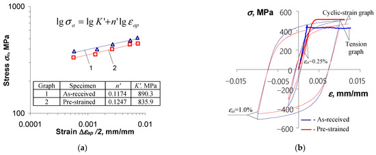 The analysis of the graphs (Figure 6) makes it possible to conclude that during cyclic loading, the plastic strain amplitude of the as-received specimens is larger than for the pre-strained specimens. This demonstrates the effect of pre-strain on the low-cycle properties of S420M steel. Comparative strain analysis of reveals that after permanent deformation , S420M steel undergoes slight hardening. Due to the lack of a clear stabilization period for this steel (cf. [20]), the hysteresis loop parameters for further analysis were determined from a period corresponding to the half-life (), as it is commonly adopted in the case of non-stabilizing materials. To describe the analytical relationship between stress and strain , an equation of the form proposed in [30] was adopted: