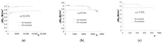 At all levels of deformation, the values of critical cumulative energy for pre-strained specimens are larger than for as-received specimens, while the differences are affected by the level of deformation. The difference between the energies is smallest at the highest strain level = 0.25%, (about 7%) and increases to about 25% at the lowest strain level = 1.0%. Despite the different loading histories and the variation in cumulative energy at different strain levels in the specimens in the as-received and pre-deformed states, the obtained cumulative energies can be described by a simple regression rule (7).
