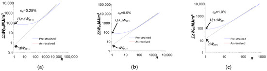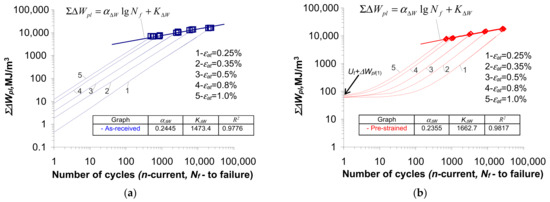 Based on the analysis of the graphs shown in Figure 12a and Figure 13, it can be concluded that small changes in energy for the samples in the as-received state (Figure 9 and Figure 10) result in a linear bi-logarithmic pattern. However, in the case of pre-strained specimens (Figure 12b and Figure 13), the linear nature of energy accumulation during the initial life period was disrupted by the pre-strain of the specimen.