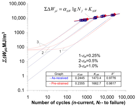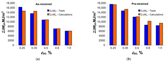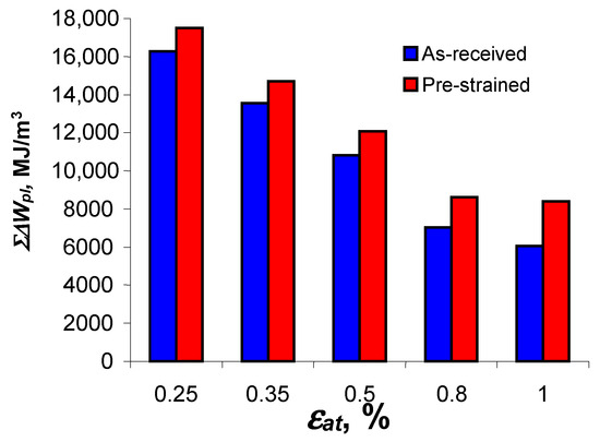 Based on the position of the graphs describing the values of cumulative energy in the as-received and pre-strained samples, it can be seen that these values are affected by the level of strain amplitude, . The energy increases as the strain level decreases. The above confirms the test results described in [4,8,12,13], among others. For direct comparison, Figure 14 shows graphs illustrating the values of critical cumulative energy (at fracture) for the as-received and pre-strained specimens.