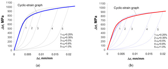 Based on a comparative analysis of the graph described by Equation (9) and the growing branches of the experimental hysteresis loops, it can be concluded that the as-received samples do not fully exhibit behavior consistent with the Masing model. By subjecting the material to pre-straining, the growing branches of the experimental hysteresis loops (Figure 13b) better fit the shape described by Equation (9). In this regard, the results confirm the findings reported in [4,19]. Due to the relatively slight variation in the position of the graph describing the ascending branch of the loop in relation to the actual loops for both types of material, in the following work it was assumed that the S420M steel adopted for the study satisfies Masing’s principle, and further calculations of the energy were carried out using Equation (11).