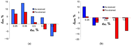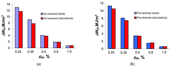 Based on the analysis of the position of the fatigue diagrams in the coordinate system, it can be concluded that they are characterized by only a slight variation. Confirmation that the differences are indeed small is provided by the similar values of the free expression and the directional coefficient of the regression equation. Based on the analysis of the graphs, there was no difference statistically at the significance level of in the results of the fatigue life tests described by Equation (6) for the as-received and pre-strained specimens. The small changes in energy as a function of the number of loading cycles confirm reports in the literature of the low sensitivity of this parameter to changes in cyclic properties, cf. [4,8,11,13]. The smaller range of plastic deformation and stress after pre-straining (Figure 6) resulted in the unit energy of the pre-strained specimens at all strain levels being lower than the unit energy obtained for specimens in the as-received state. To illustrate the differences, Figure 11 compares the energy values corresponding to half of the fatigue life , at five strain levels, for the as-received and pre-strained samples.