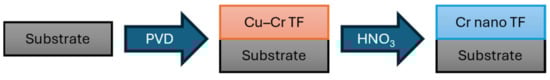 The selective dissolution of copper was obtained using a diluted 1:4 solution of nitric acid (HNO3, purchased from Sigma-Aldrich in the form of 65% aqueous solution), following previous studies [35,36]. The samples were dipped in the acid solution for 1 h and for 24 h to verify the evolution of the relative concentration of copper and chromium. In these conditions, copper is active and should be dissolved, while chromium should be still in its passivated form. The production process of the chromium nanostructured TFs is summarized in Figure 1.
