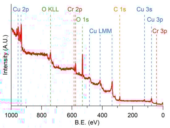 To verify our hypothesis concerning the formation of the passivated chromium oxide layer, XPS analysis was performed. This kind of analysis permits us to obtain information from the first few angstroms (from 10 Å to 15 Å, or from 1 nm to 1.5 nm) due to the low mean free path of the photoemitted electrons in the solid matter. In Figure 2, the survey spectrum of the sample Cu50-Cr50 150 is reported as an example, with the association of each peak to the corresponding transition.