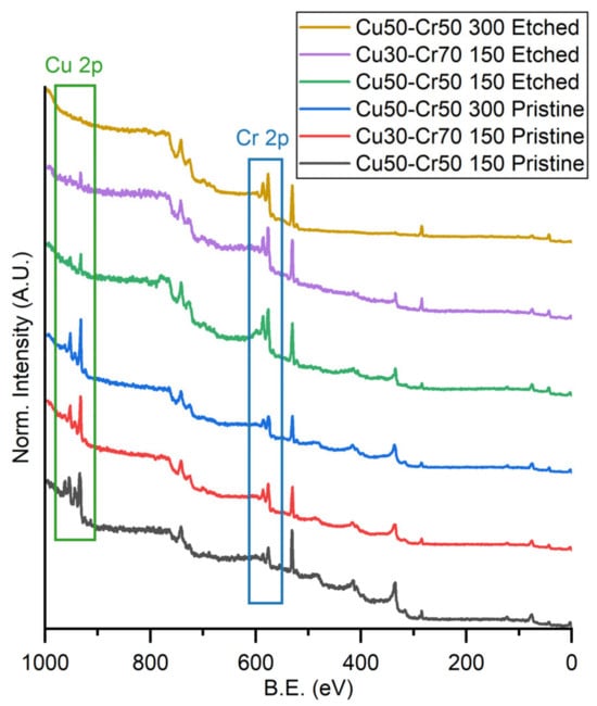 Comparison of the XPS survey spectra of the three samples before and after the dealloying process (etched). The green box highlights the Cu 2p region and the blue box highlights the Cr 2p region.