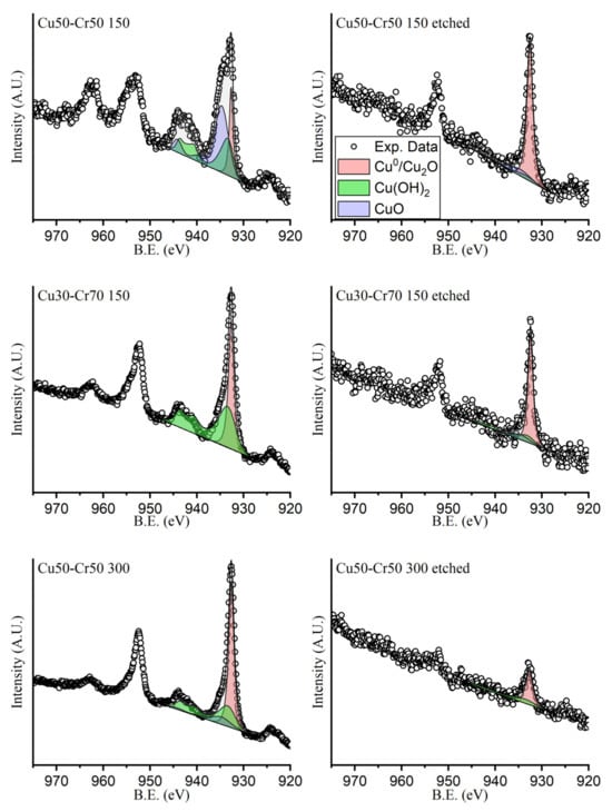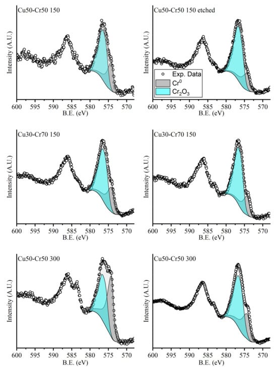 In Figure 4, it is possible to note that the relative amounts of metallic chromium and chromium oxide do not change significantly in the various spectra due to the native oxide formation on the surface of the sample. The only sample that shows a different composition is the Cu50-Cr50 300 one, which has higher concentrations of chromium oxide, probably due to the high temperature of deposition that brings about the formation of a thick layer of oxide directly in the instrument.