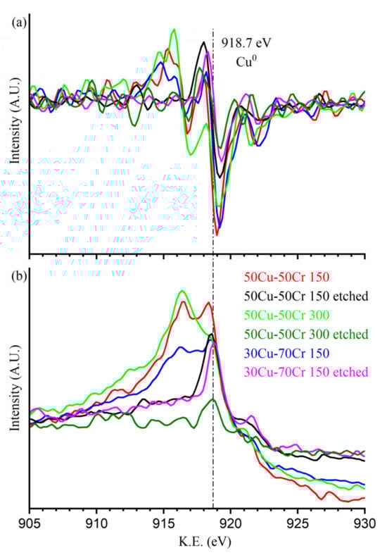 In Figure 5, it is possible to note that all the fully oxidized components of copper (CuO and Cu(OH)2), likely located on the outer surface of the sample due to copper’s natural tendency to oxidize, are removed during the dealloying process. This fact is evidenced both from the fitting and, as confirmation, from the disappearance of the shake-up peaks (the two broadened peaks at about 943 eV and 963 eV) typically present in the compound of copper (II). On the other hand, the metallic or partially oxidized copper (Cu0/Cu2O) was removed only in the sample Cu50-Cr50 300, where the dealloying solution can reach the inner part of the deposited film, thanks to the continuity of the larger copper domain that protrudes more deeply. In any case, as it is possible to see by matching the data from the Cu 2p photoelectron line and the Auger peak reported in Figure 6, the stable presence of metallic copper after the dealloying process suggests that copper is located below the passivating layer of chromium oxide and not exposed to the oxygen in the atmosphere, which can easily lead to the complete oxidation of copper. The suggested presence of metallic copper in the as-prepared sample can be proof of a certain degree of admixing of the deposit, which might have led to the formation of an alloy with a solubility of copper in chromium that is sensibly lower, even at a higher temperature, with the canonical methods employed to produce alloys [34].