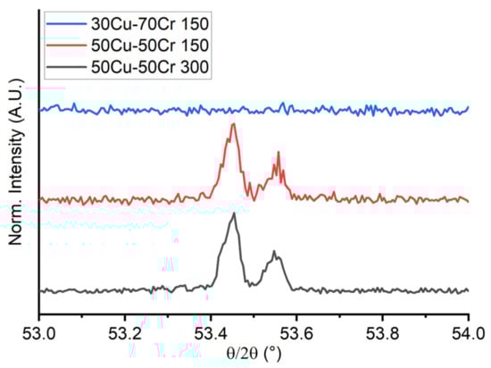 In the samples with a composition of 50 wt.% copper and 50 wt.% chromium, both deposited at 150 °C and 300 °C, the {200} diffraction peak of copper was recognized, but we did not detect any peak attributable to chromium, meaning that chromium was deposited in a quasi-amorphous structure. This is a finding that can be reasonably explained with the higher melting temperature of chromium and the higher tendency to form solid deposits without long-range ordering when realized at low temperature. In the sample 30Cu-70Cr 150, no diffraction peaks attributable to the thin film were recognized, probably due to the low content of copper that might be an obstacle by the high quantity of chromium in the coarsening process and not being able to form bigger domains. In Figure 7 is reported the comparison of the high-resolution XRD diffraction patterns of the region of the {200} reflex of copper for the three samples.