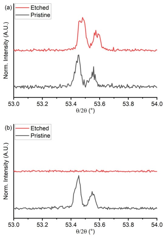 In Figure 8 are reported the comparisons of the high-resolution XRD diffraction patterns of the {200} reflex of the copper region before and after the selective dissolution. In Figure 8b, it is possible to note that the reflex disappears after the dealloying process in sample 50Cu-50Cr 300, confirming the removal of the copper from the thin film; quite the opposite, the reflex remains in the sample 50Cu-50Cr 150 (Figure 8a).