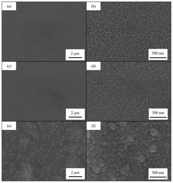 The surface morphologies of the samples were investigated with scanning electron microscopy (SEM). The instrument was a SU3800 scanning electron microscope (Hitachi High-Tech, Tokyo, Japan). The analysis was performed on the samples obtained on silicon substrates. Before using the sample deposited on silicon, we ensured that the substrate did not affect the superficial morphology.