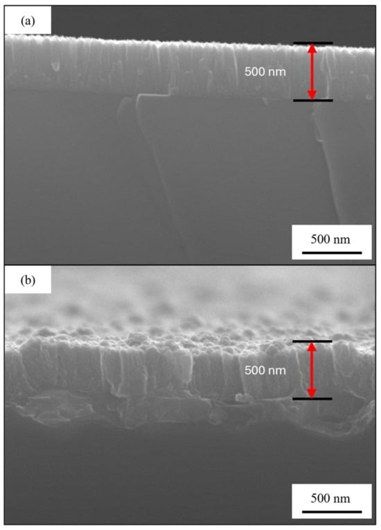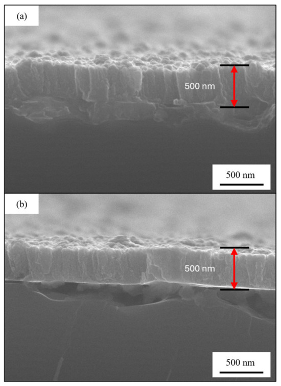 The samples 30Cu-70Cr 150 (Figure 9a,b) and 50Cu-50Cr 150 (Figure 9c,d) show similar surface morphology, both in terms of the dimension (about 50 nm of diameter) and the shape of the crystals (polygonal). The sample 50Cu-50Cr 300 (Figure 9e,f) shows a different structure, with bigger crystals (about 100 nm of diameter), and a different shape (more spherical). This difference can probably be attributed to the different temperatures during growth and the different degrees of oxidation. To better evaluate the difference between the samples obtained at different temperatures, the silicon wafer was broken following the crystal plane of the substrate, obtaining a brittle fracture that let us acquire an image of the cross-section. In Figure 10, the cross-section images of samples 30Cu-70Cr 150 (Figure 10a) and 50Cu-50Cr 300 (Figure 10b) are reported.