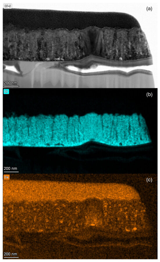Figure 12 shows the TEM analysis of the cross-section of the 50Cu-50Cr 300 sample. To obtain the image, lamella preparation was performed using a Tescan GAIA 3 FIB/SEM microscope, equipped with a Ga ion column. A 30 keV Gallium ion beam was used for the milling procedure, while the final polishing/de-amorphization was carried out at 5 keV. The final lamella thickness was below 50 nm. A protective layer was first deposited from an organometallic Pt precursor on the surface of the sample to avoid dulling of the film cross-section during ion beam etching. This platinum layer, which is not reported in the following STEM EDX maps, was produced in two steps: (a) the first thin Pt deposit achieved by electron beam at 5 kV and (b) a second massive 2 µm Pt deposit.