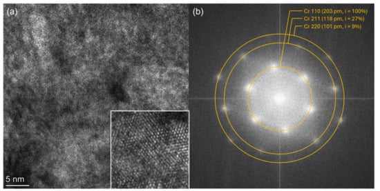 The HR-TEM images acquired of the TF portion of the lamella evidenced the presence of a crystallographic order in the form of lattice fringes (Figure 13a). By converting the image into the frequency domain using the fast Fourier transform (FFT), different signals appear. An analysis of the FFT highlights the presence of cubic Cr(0). By comparing the simulated diffractograms from the Inorganic Crystalline Structure Database (ICSD) for cubic Cr (1751627) and cubic Cu (1765816), it is in fact possible to define the presence of Cr 110 (203 pm, i = 100%), Cr 211 (118 pm, i = 27%) and Cr 220 (101 pm, i = 9%) (Figure 13b). The Cu 111 (208 pm, i = 100%) and Cu 222 (104 pm, i = 8%) that fell near could be excluded, together with the Cu 220 (128 pm, i = 24%). Still, we were not able to acquire an image in an area in which we were certain of the presence of the Cu phase.