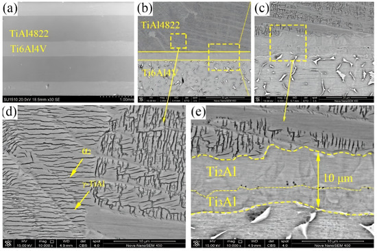 Figure 6c,e illustrate the formation of an interface layer with an approximate thickness of 10 µm between the TiAl4822 layer and the Ti6Al4V layer. The interface layer can be distinctly categorized into two regions: the region near TiAl4822 (with the thickness of approximately 6 µm) and the region near Ti6Al4V (with the thickness of approximately 4 µm).