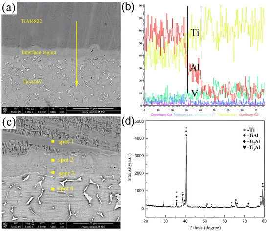 The XRD patterns of the interface region are illustrated in Figure 7d. The results of XRD analysis revealed the presence of the -Ti, -Ti, -Ti3Al, Ti2Al, and -TiAl phases in the interface. The typical phases of the TiAl4822 alloy consisted of and phases as marked in Figure 6d. Meanwhile, the typical phases of Ti6Al4V were the and phases [33]. The line scan result in Figure 7b indicated that the aluminum element content within the interface region varied between 20% and 36%. Based on the Ti–Al binary phase diagram [34], it can be inferred that the phase existed in the interface area. This result, when considered alongside the EDS analysis results in Table 2, indicated that the two regions in the interface layer consist of the -Ti3Al and Ti2Al phase, respectively.