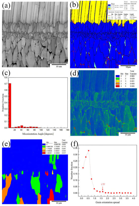 EBSD analysis of the TiAl4822/Ti6Al4V MIL cross-section: (a) grain morphology, (b) phase distribution and grain boundary diagram, (c) grain angular orientation difference, (d) KAM map of MIL, (e) image quality mapping of GOS values and their volume fractions, (f) critical GOS value.