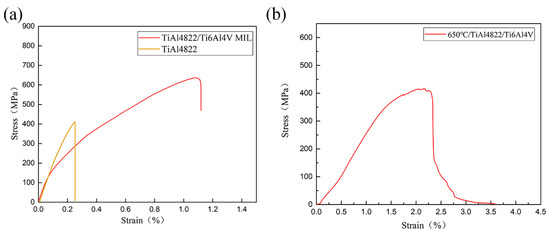 Tensile stress–strain curves of: (a) TiAl4822/Ti6Al4V MIL composite and TiAl4822 at room temperature; (b) TiAl4822/Ti6Al4V MIL composite at 650 °C.