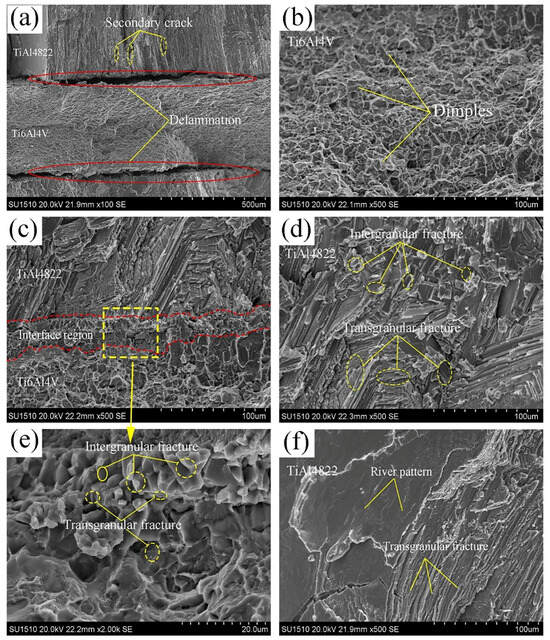 Fractographies of the TiAl4822/Ti6Al4VMIL composite: (a) fracture surface of the cross-section, (b) morphology of the Ti6Al4V ductile fracture, (c,e) fracture morphology of the interface region, and (d,f) brittle cleavage and quasi cleavage fracture morphology of TiAl4822.