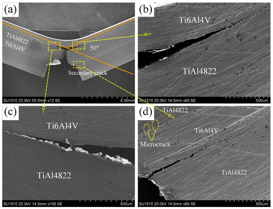 According to the calculations based on Formula (1), the fracture toughness value of TiAl4822/Ti6Al4V MIL composites, measured in the direction parallel to the hot pressing, is 33.15 MPam1/2. Due to the exceptional toughness of Ti6Al4V, as well as the existence of interface regions, the MIL exhibits superior fracture toughness compared to the as-cast TiAl4822 alloy (7.2 MPam1/2). Figure 13 shows the crack propagation characteristics of the TiAl4822/Ti6Al4V MIL fracture toughness specimen. As shown in Figure 13a, the unilateral notch of the fracture toughness sample is positioned on the Ti6Al4V layer. Under the application of external loads, the primary crack initially develops at the single-sided notch. As the load increases and the primary crack propagates upward toward the interface region, secondary cracks preferentially initiate at the interface between the TiAl4822 layer and the Ti6Al4V layer. These secondary cracks subsequently propagate laterally along this interface rather than parallel to the direction of the applied load. This crack propagation behavior is consistent with the findings reported by Zhu [15]. Due to the high brittleness of TiAl4822, the crack resistance is rather small. Therefore, the TiAl4822 layer presented a brittle fracture when the main crack propagated. No crack deflection was observed during this process. Additionally, exist some small cracks that were identified at the interface area between this layer of TiAl4822 and the middle layer of Ti6Al4V, as shown in Figure 13d. The crack continued to propagate until it was blocked by the top layer of Ti6Al4V, attributed to its superior room temperature toughness. Ultimately, the main crack is fractured and the secondary crack started to expand further along the interface layer to both sides, as shown in Figure 13b,c. From Figure 13a, it is observed that the Ti6Al4V layer of the top layer exhibits considerable deformation with the bending angle of approximately 50°. During crack propagation, crack deflection and the generation of micro cracks can dissipate the energy required for crack propagation, thereafter, improving the fracture toughness of MIL.