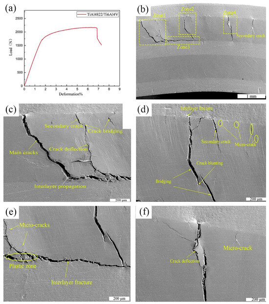 A three-point bending test was conducted on the TiAl4822/Ti6Al4V MIL composite in the direction parallel to hot pressing direction. The bending strength was measured as 1114.1 MPa, while the deformation reached 7.28%. Figure 14 shows the load–deformation curve and crack propagation characteristics of the composites. TheTiAl4822/Ti6Al4V MIL composite did not experience complete fracture during the testing process. Given that the outer layer bore the maximum bending stress, cracks predominantly initiated in the outermost layer of TiAl4822 matrix, as presented in Figure 14b. The Ti6Al4V layers did not fracture due to their excellent ductility. Initially, minute cracks initiated at the upper surface of the outer TiAl4822 layer and propagated downward. With the increasing loading, these cracks propagated within the TiAl4822 layer and formed the main cracks throughout the whole layer (Figure 14c). Subsequently, the presence of the Ti6Al4V layer impeded the propagation of these cracks, resulting in their deflection and progression along the interface region. It also can be observed that secondary cracks initiated within the TiAl4822 layer. Concurrently, microcracks initiated in the loading direction due to the intrinsic brittleness of the TiAl4822 alloy (Figure 14d). Energy absorption phenomena, such as crack blunting, bridging, and deflection can be observed in Figure 14c,d. Additionally, local plastic deformation and interface delamination were also observed as shown in Figure 14e,f. Energy dissipation will increase with the increase in crack propagation paths, thereby the fracture toughness of the MIL composite will consequently be enhanced.