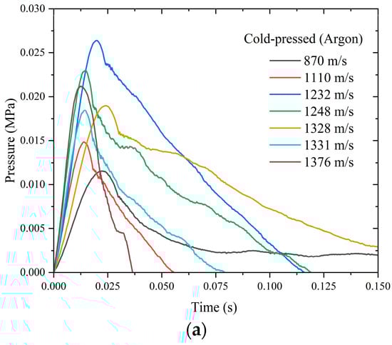 Quasi-static pressure and time curves of the two materials under the different gas atmospheres: (a) cold-pressed material under the atmosphere of argon; (b) cold-pressed material under the atmosphere of air; (c) skeleton-structured material under the atmosphere of argon; and (d) skeleton-structured material under the atmosphere of air.
