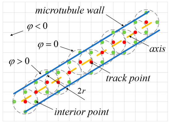 The set of coordinates in Formula (7) represents the global coordinate system for a point describing the interior of microtubule i. denotes the collection of trajectory points for microtubule i, while represents the sphere equation and signifies the radius of microtubule i. The specific effect can be observed in Figure 4.