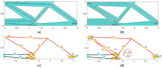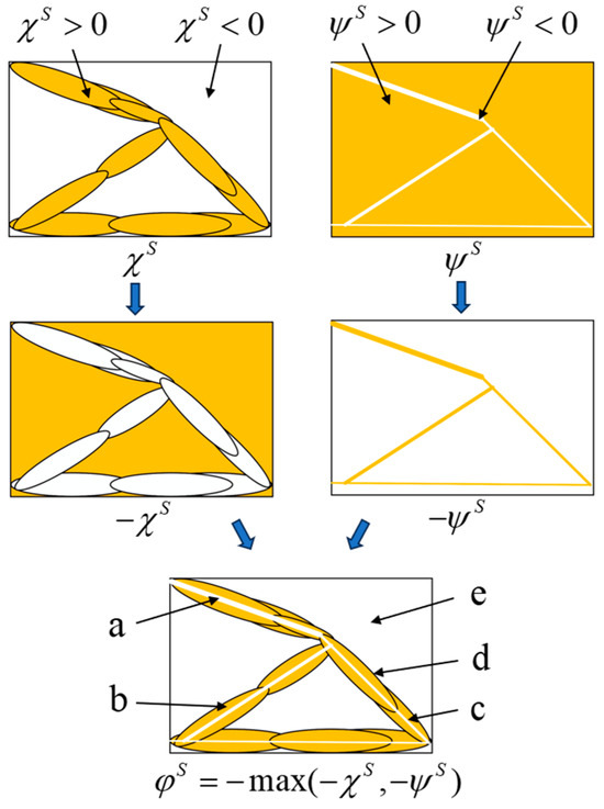 In Figure 5, the subgraphs corresponding to and , respectively, represent the topological distribution of the macroscopic structure and the self-healing carrier in the design domain. There are only two colors—yellow and white—representing the solid and void properties in the design domain, respectively. These correspond to the positive and negative values of the topological description function, respectively, and the interface between the solid and void regions corresponds to the zero value in this function. By introducing a negative sign to the topological description function, the roles of the solid and the void can be interchanged within the design domain. Utilizing this characteristic, the topological description functions of the macroscopic structure and the self-healing carrier can be logically operated to obtain the topological description function of the self-healing structure, and the topological description values of the regions a–e are shown in Table 1.