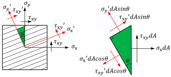 The stress components in the global coordinate system, namely , , and , represent the stresses along the x-direction, y-direction, and shear direction, respectively. Additionally, denotes the transformation matrix.