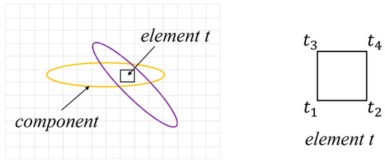 By substituting the coordinates of the four nodes t1, t2, t3, and t4 into the topological description functions of each component, we obtain the topological description values of the elements in different components and identify the component index j where the maximum value is located. Finally, the variable from the perspective of component j is substituted into Equation (21) to obtain the stiffness matrix of element t.