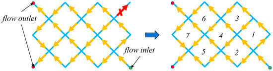 In Equation (23), the pipe section flow rate Q needs to be solved based on the distribution of the microtubule network carrier and using the Hardy Cross method. The Hardy Cross method continuously corrects the flow rates of each pipe section by using the flow conservation equation (the algebraic sum of the inflow and outflow rates at any node of the pipe network is zero) to make the flow distribution of the microtubule network closer to the actual situation. However, when correcting the flow rates of each pipe section in the microtubule network, it is necessary to initially allocate the flow rates of each pipe section in the microtubule network first, then find all the minimum loops in the microtubule network, combine the corresponding pipe section flow rates, substitute them into the correction equation to calculate the corrected flow rate, and finally complete the correction of the pipe section flow rate.