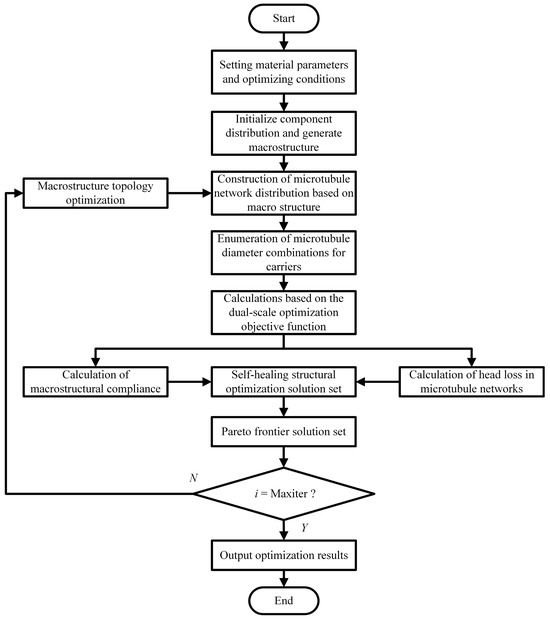 To address the conflicting requirements of mechanical and self-healing properties in self-healing structures, a dual-scale collaborative optimization method is proposed, integrating the Pareto criterion and MMC. This method yields a set of non-inferior solutions. The dual-scale collaborative optimization framework is illustrated in Figure 10. The optimization process involves the following steps:
