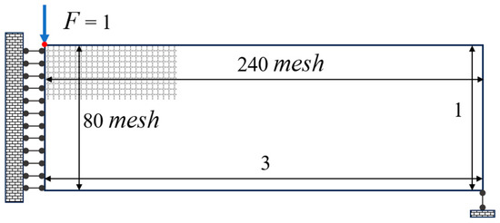 In this case, owing to the symmetrical nature of the MBB beams on both sides, only half of the structure is analyzed to minimize computational time. The semi-structural design domain and working conditions of the MBB beams are illustrated in Figure 11. The design domain measures three units in length and one unit in width. It is discretized using a square finite element mesh with dimensions of 240 elements along the length and 80 elements along the width. The finite element cells are four-node planar elements. The left boundary of the design domain is constrained in the transverse direction, while the lower-right corner is constrained in the longitudinal direction. A vertical downward load of 1 N is applied at the upper-left corner. The volume constraint is set to ≤ 0.45.