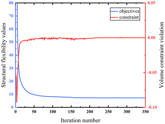 After 200 iterations of optimization, the flexibility stabilizes at a consistent value and continues to be iterated up to the 350th generation. The final flexibility of the MBB beam structure is 7.265, which corresponds to the optimized MBB beam structure after 350 generations, as illustrated in Figure 14.