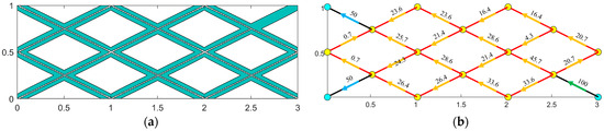 Once the microtubule network is established, it is crucial to define specific outlets and inlets for the network (as shown in Figure 9) and remove any stagnant sections within the microtubule network (e.g., the upper-right segment illustrated in Figure 15a). This step is essential because these segments cannot be infused with the repair agent, leading to zero flow rates. In the design of the microtubule network carrier, a uniform configuration is adopted: one inlet and two outlets. The repair agent is injected into the inlet at a flow rate of 100 cubic millimeters per second (100 mm3/s), while each of the two outlets has an output flow rate of 50 cubic millimeters per second (50 mm3/s). Excluding the pipe sections associated with the entrances and exits of the microtubule network, the flow rates in the remaining pipe sections are determined iteratively by applying the Hardy Cross method to the loops of the microtubule network. Figure 15b illustrates the initial carrier flow distribution derived from this solution.
