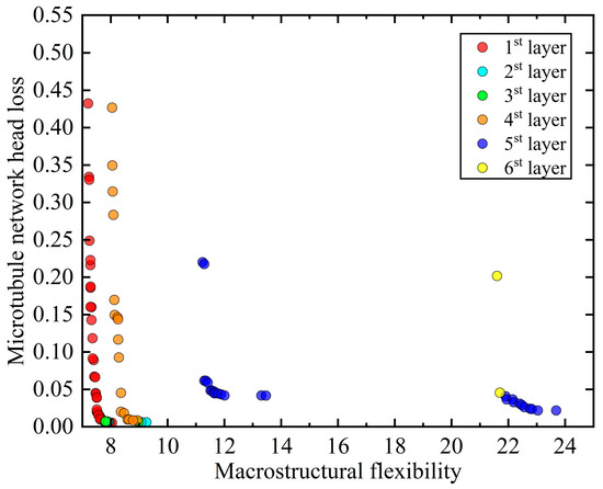 The results of the dual-scale collaborative optimization under the variable-angle fiber design were analyzed, and two representative structures were selected for further examination (Figure 18). The optimal solution for flexibility featured a significantly lower carrier proportion and smaller pipe diameter compared to the optimal solution for head loss. Consequently, this configuration resulted in higher fluid resistance and increased head loss. Additionally, the analysis of the carrier flow distribution in the microtubule network revealed a similar distribution pattern in the upper-right corner of both structures. However, due to the larger diameter of certain pipe sections in the head loss optimal solution, more flow could be allocated, thereby reducing fluid resistance. Nevertheless, the increased diameter of these sections also led to greater material usage, which in turn reduced structural flexibility, aligning with the observed structural parameters. Compared with the structural flexibility of single-objective optimization, the dual-scale collaborative optimization solution set offers more flexible solutions. Even when compared to the least flexible solution in this set, the structural flexibility increases by only 10.64%, while its head loss is significantly reduced. Unlike Wang et al. [27], who optimized the distribution of microtubule network carriers under a given structure to achieve better mechanical properties, the dual-scale collaborative optimization enhances both the mechanical and self-repairing properties of self-repairing materials. The average optimization time for each single solution is just 0.52 s, which is only 0.1 s longer than that of single-objective optimization. Additionally, due to its pipe network design following the structural configuration, it exhibits much higher optimization efficiency compared to the separate orthogonal microtubule network design of Tan et al. [28].