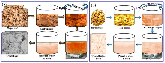 Schematic representation of the chemical treatment process applied to (a) maple leaves and (b) herbal waste.