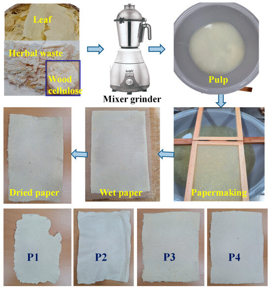 Dried and delignified leaves, herbal waste, and balsa wood cellulose were mixed in various weight percentages to produce pulp: 100% leaf (P1), 100% herbal waste (P2), 75% leaf + 25% herbal waste (P3), and 75% leaf + 25% balsa wood cellulose (P4). These ratios were randomly selected to provide an initial assessment of pulp and paper production using different combinations of leaves, herbal waste, and wood cellulose. The mixtures or individual cellulose samples were placed in a mixer grinder with sufficient water and processed for approximately 2 min to form pulp. The resulting pulp was then transferred to a large plastic container, where additional water was added and thoroughly mixed. Paper was formed using available equipment, as shown in Figure 2. Excess water was removed using a sponge and cloth. The prepared paper was then placed under a wooden plate with a 1 kg weight bar applied for pressure and dried in a hot air oven. A schematic of the papermaking process is shown in Figure 2. The selected fiber compositions were chosen to explore the individual and combined effects of non-wood fibers on paper properties. Each composition serves a distinct purpose: P1 and P2 provide a baseline for evaluating the mechanical and structural contributions of leaf and herbal waste fibers individually, while P3 examines the benefits of blending these non-wood fibers. P4, incorporating wood pulp, offers a comparison to traditional papermaking. This approach allows for a comprehensive assessment of the potential of herbal waste and maple leaves as sustainable alternatives, shedding light on how different fiber ratios can be optimized for diverse papermaking applications.