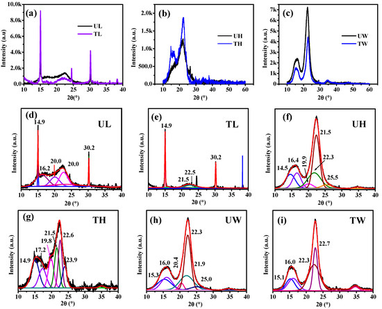 XRD spectra of (a) leaves, (b) herbal waste, and (c) balsa wood. Deconvoluted spectra of (d) untreated leaves (UL), (e) treated leaves (TL), (f) untreated herbal waste (UH), (g) treated herbal waste (TH), (h) untreated wood (UW), and (i) treated wood (TW).