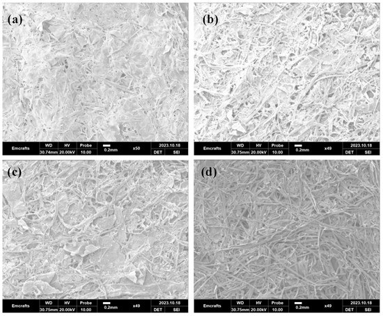 Additionally, SEM analysis was conducted to visualize the fibrous properties more clearly. The SEM images, shown in Figure 6, along with the optical images, support the isotropic properties of the P2 and P4 samples and provide insights into the surface roughness. Furthermore, using ImageJ software (online, v.1.50d), the average fiber diameters were quantified as follows: P1: 0.031 ± 0.008 mm, P2: 0.052 ± 0.017 mm, P3: 0.040 ± 0.006 mm, and P4: 0.047 ± 0.008 mm.