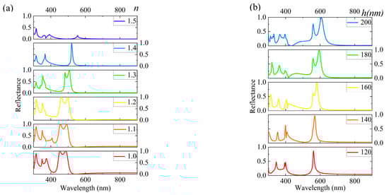 Then, the sensing performance of the nanostructure is studied as shown in Figure 6. Figure 6a shows the change in the reflection spectrum of the nanostructure in the process of changing the RI n from 1.0 to 1.6. The peak wavelength of the nanostructure will be red shift and the reflection efficiency is almost unchanged; only when n = 1.6 does the reflection efficiency decrease. Here, this phenomenon is attributed to the fact that the increase in sensing medium value can increase the damping of the dipole mode. The peak wavelength of the reflection spectrum has shifted from 568.9 nm to 648.4 nm, covering a range of 79.5 nm. Figure 6b shows that the reflection spectrum is highlighted by the CIE model, with the color changing from yellow through red to purple.