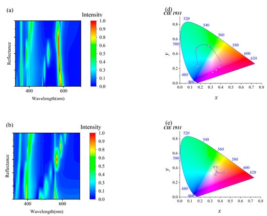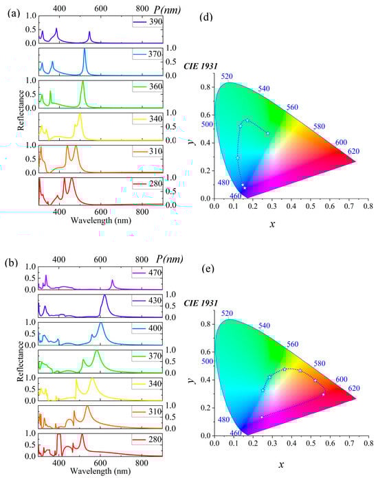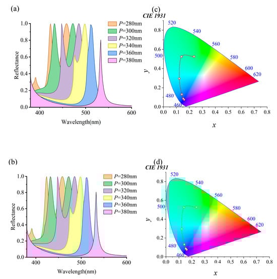 Subsequently, we investigated the specific manifestations of polarization states. Figure 5 shows that the spectra of transverse electric (TE) and transverse magnetic (TM) modes almost completely overlap. This phenomenon shows that the structure responds similarly to different polarization waves. In other words, within the studied frequency range, polarization states have minimal effect on the metasurface’s optical properties and can be ignored. Within the simulated frequency range, TE and TM polarization waves show similar propagation and reflection, resulting in nearly identical spectra. This discovery suggests that the metasurface structure designed has effectively balanced and optimized the response to different polarization waves, eliminating the need for specific control tailored to individual polarizations. This study not only enhances the understanding of polarization states but also provides a new perspective and approach for metasurface design, potentially offering impetus to the development of spectral control technologies. To further clarify this trend in color variation, Figure 5e–g illustrates the changes in reflection spectra as the periodicity varies, highlighting the corresponding shifts in structural color. It is evident that, when the reflection reaches its peak, it aligns with the observed color transitions on the 1931 CIE color space diagram.