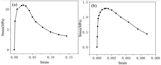Based on the “parallel rod model”, it is assumed that the components of CA mortar consist of a system of N microscopic rod elements arranged in parallel. These microscopic rods behave as linear elastic bodies before damage occurs but lose their load-bearing capacity after damage. The viscous component within the CA mortar does not sustain damage and deforms in coordination with the microscopic rods. The strain of each microscopic rod that undergoes damage follows the Weibull distribution. Based on the established experimental and theoretical studies on the properties of CA mortar [36], the following equation was chosen to describe the stress–strain relationship of CA mortar: