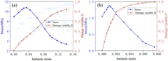 Stress—inelastic strain and damage variable—inelastic strain curve for CA mortar: (a) compressive properties and (b) tensile properties.