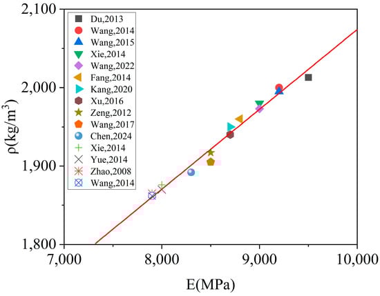 For materials similar to concrete, there is typically a positive correlation between elastic modulus and density. To explore this relationship, data from fifteen literature [17,35,39,40,41,42,43,44,45,46,47,48,49,50,51] that conducted tests on CA mortar were selected. The elastic modulus and density of the prepared CA mortar samples, as reported in the literature, were plotted as scatter plots in Figure 3. Analysis of the scatter distribution in Figure 3 revealed a positive linear correlation between the elastic modulus and density of CA mortar. A linear fit was applied to the scatter points in Figure 3, and the resulting linear equation is presented in Equation (7). Here, the unit of density ρ is kg/m3 and the unit of elastic modulus E is MPa. With this established relationship between the density and elastic modulus for CA mortar, adjusting the elastic modulus effectively allows for simultaneous control over the density.